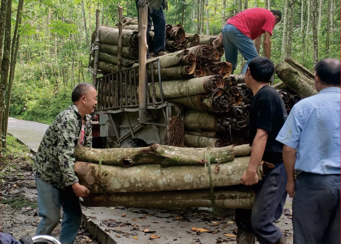 村民用拖拉机装载运输厚朴中药材下山