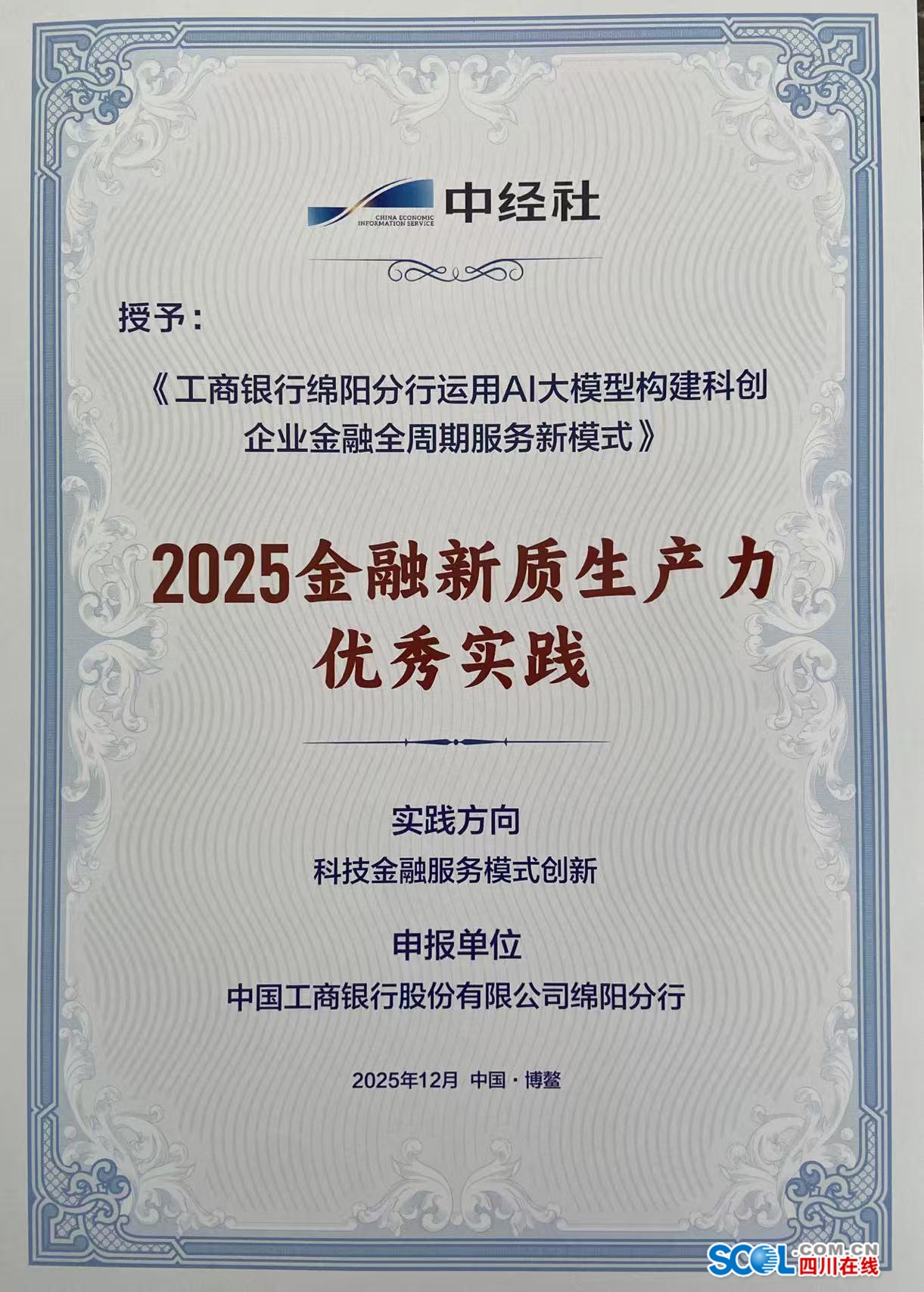 四川在线消息(绵阳频道 罗琳)12月4日,2025企业家博鳌论坛期间,中国工商银行绵阳分行(以下简称“工行绵阳分行”)凭借《运用AI大模型构建科创企业金融全周期服务新模式》实践案例,成功斩获“2025金融新质生产力优秀实践”奖项,成为此次全国仅有的两家获奖地市级金融机构之一,其在科技金融领域的创新探索获得行业高度认可。