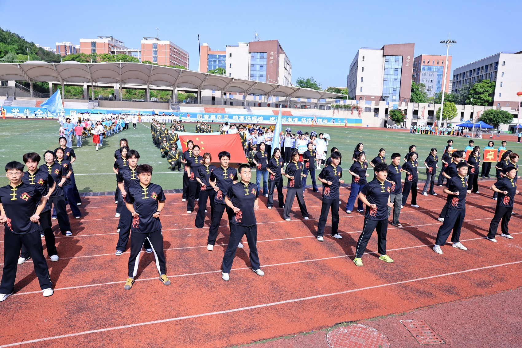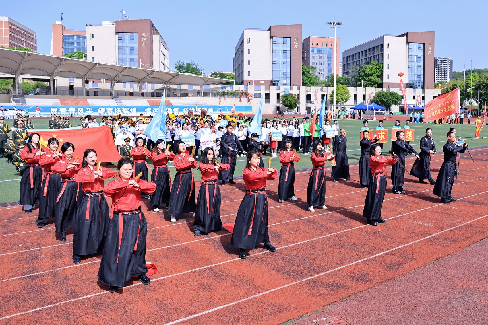 太极展演结束后,15支师生代表方阵将专业特色融入队列展示——有的方阵手持中草药标本走秀,有的方阵表演中华传统武术,与千人太极共同构成传统与青春共生的画面。