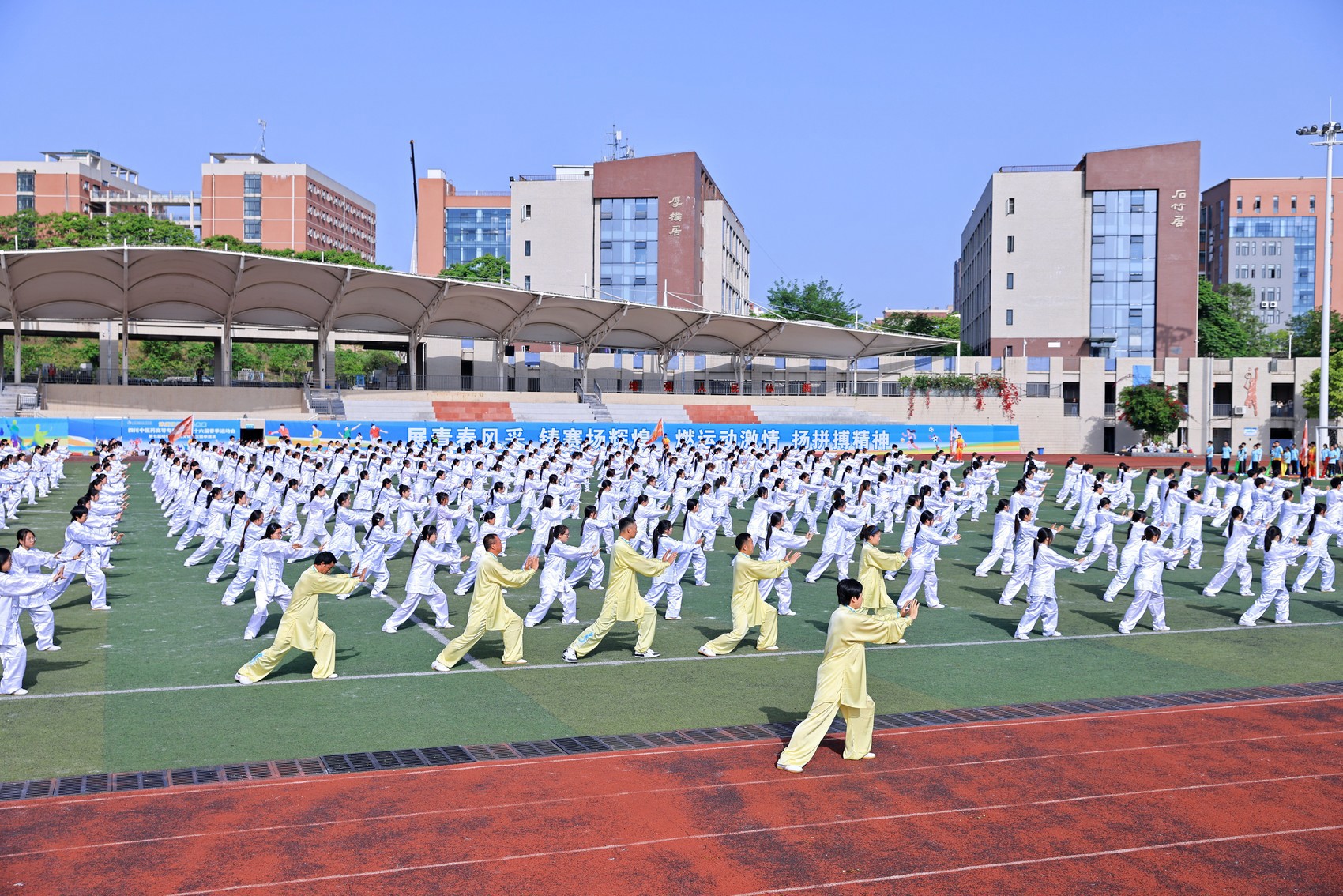野马分鬃、白鹤亮翅……4月23日,四川中医药高等专科学校运动场上,千余名师生身着统一练功服,在悠扬古乐中缓缓起势,同练一套太极拳,拉开了该校第十六届春季运动会暨第七届岐伯中医药文化节太极拳展演的序幕。