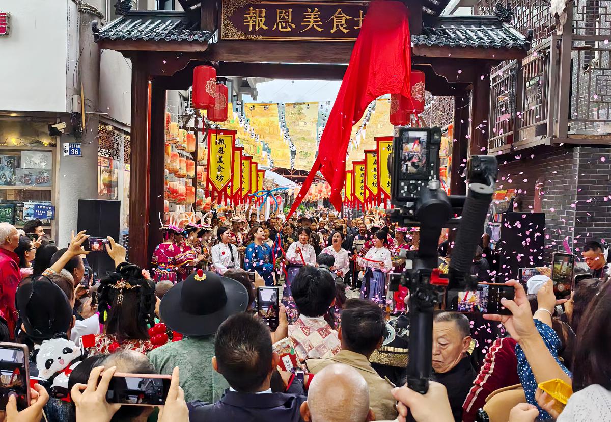 长假首日,全新打造的报恩美食坊文化街区正式开街。红绸高悬的牌坊下,白马姑娘盛装歌舞迎宾,青石板路上,“货郎NPC”派发仿古银票,六大主题打卡点人流如织。