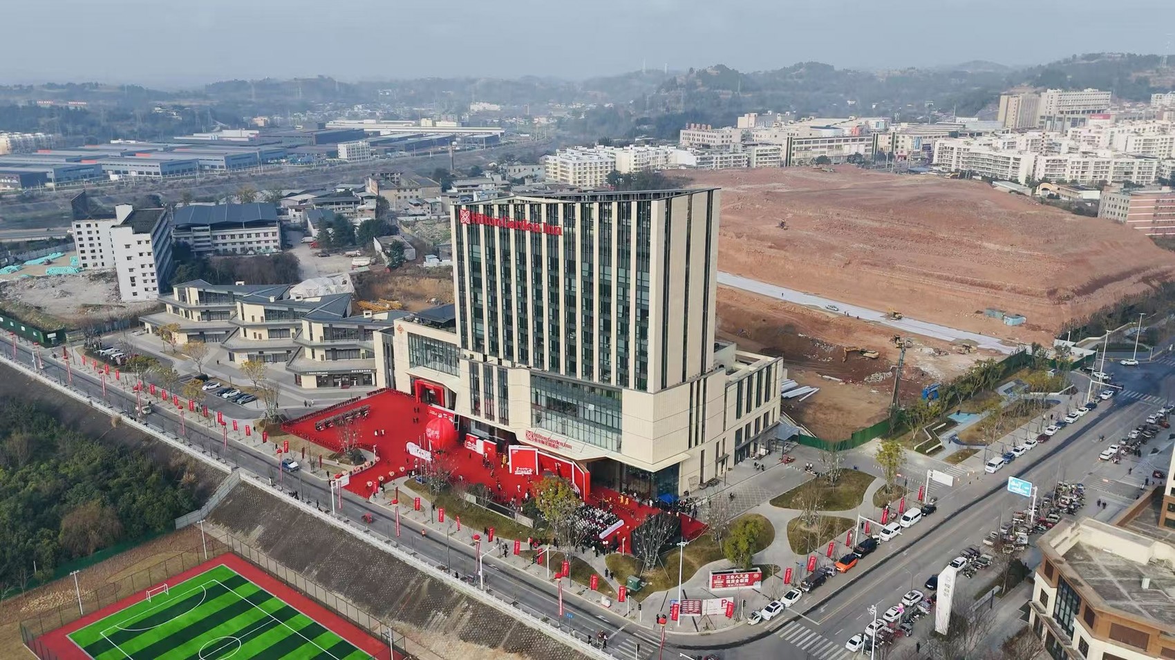 项目自2022年3月动工以来,以“三台速度”高效推进,曾因超额完成投资与进度被市投促委评为“骏马项目”。截至投运,项目一期建筑已全部建成,涵盖特色商业街、文化广场、大型商业服务中心及引入的希尔顿花园酒店等核心业态,预计将提供零售、餐饮、酒店等数百个就业岗位,有效吸纳城乡劳动力。