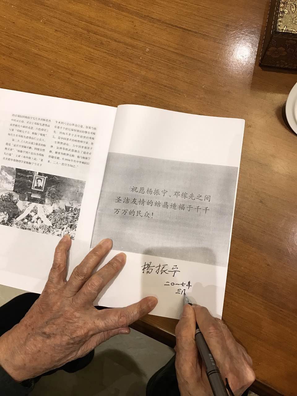在休息室里,李婷递上邓稼先夫人许鹿希所著的《邓稼先图片传略》请杨振宁签名。他轻轻摩挲封面,翻到许鹿希对他和邓稼先的祝福语那页,写下了自己的名字。那一刻,李婷忽然想起邓稼先临终前两人的合影,想起邓稼先信里“但愿人长久,千里共同途”的嘱托。