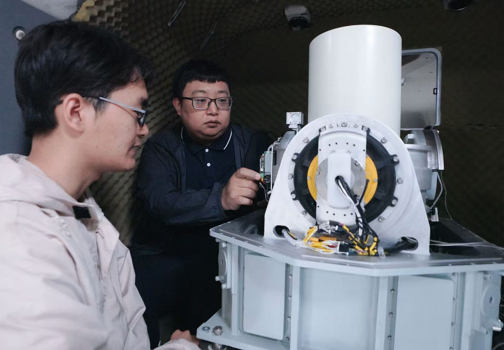 武跃龙(右)正在调试设备(郭超英摄)