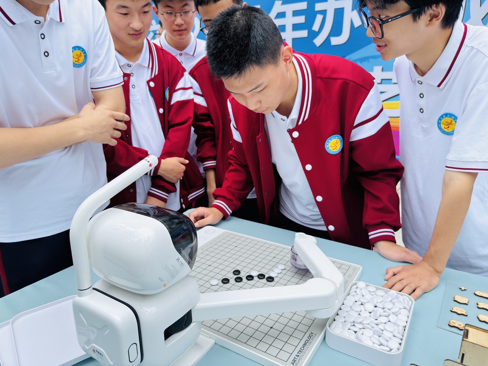 科技成果展示区,身着校服的学生正全神贯注地与机器人对弈五子棋,围观的同学忍不住出谋献策。不仅如此,还有天文望远镜、AI互动、机器人、无人机……漫步校园,科技文化艺术节的各项活动正如火如荼地展开,科普设备琳琅满目,参与的同学们兴致盎然。