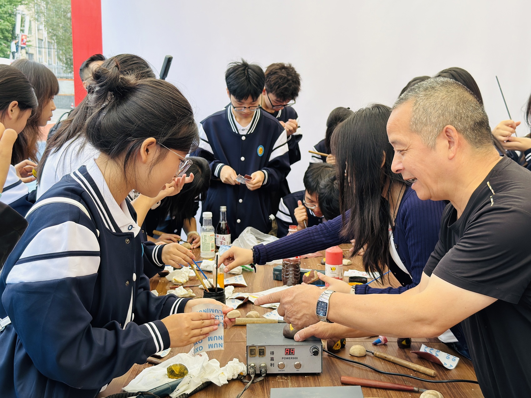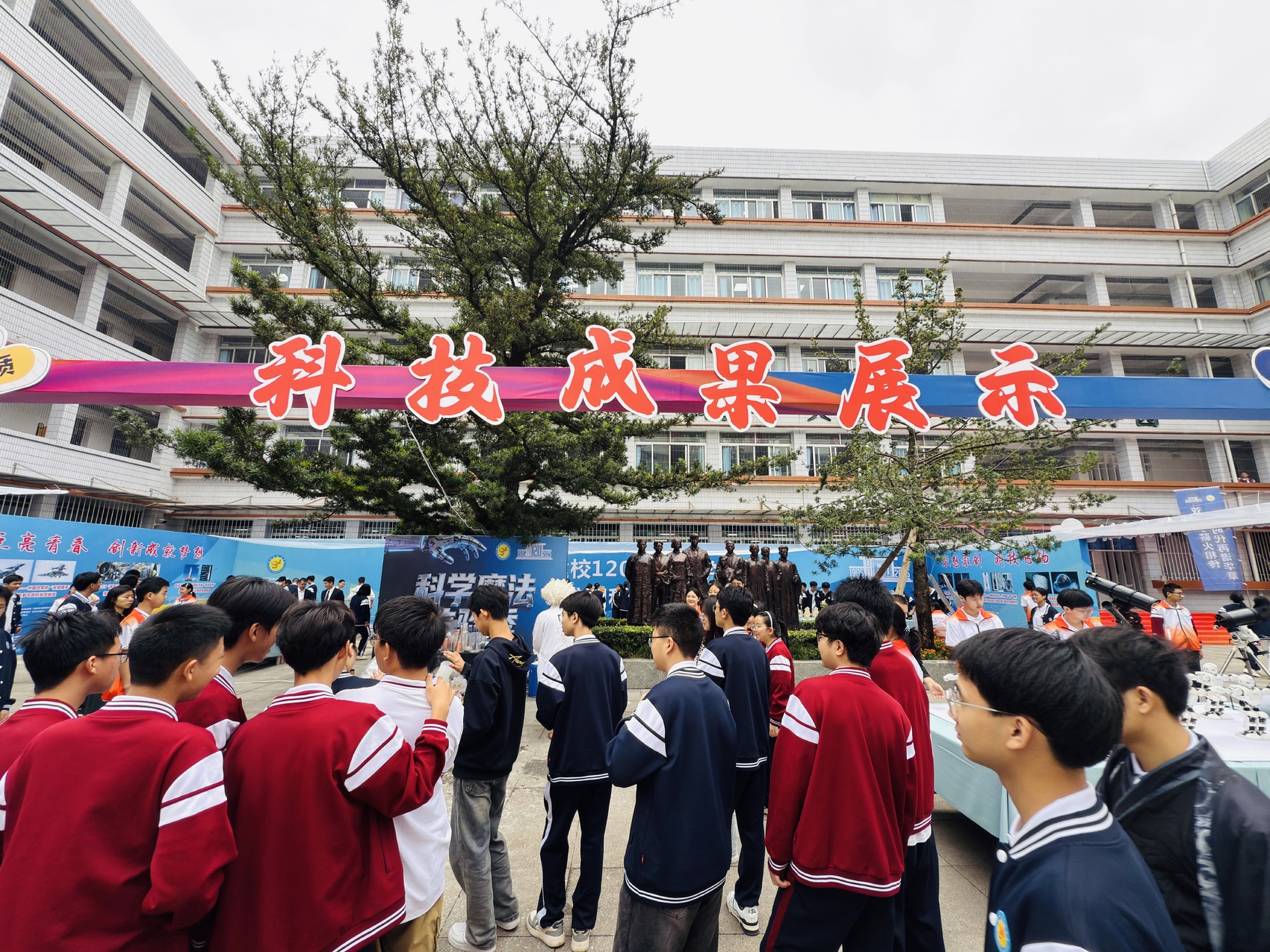 教学楼前,身着汉服的同学们玩起了蹴鞠,动作轻巧灵动;非遗互动区,三台剪纸代表性传承人兰小奇细心为同学们演示剪纸步骤;校门上方,“热烈庆祝三台中学建校120周年”的巨幅红色绸幅格外醒目,整个校园仿佛一个盛装以待的母亲,正等待着四面八方的游子归来。