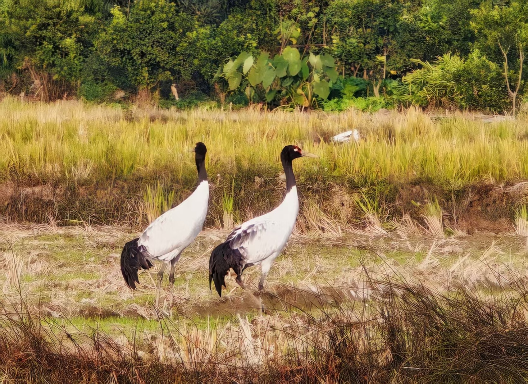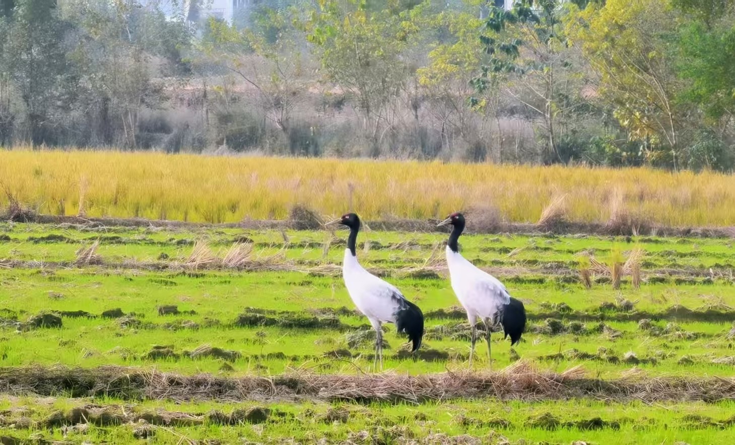 黑颈鹤在农田漫步