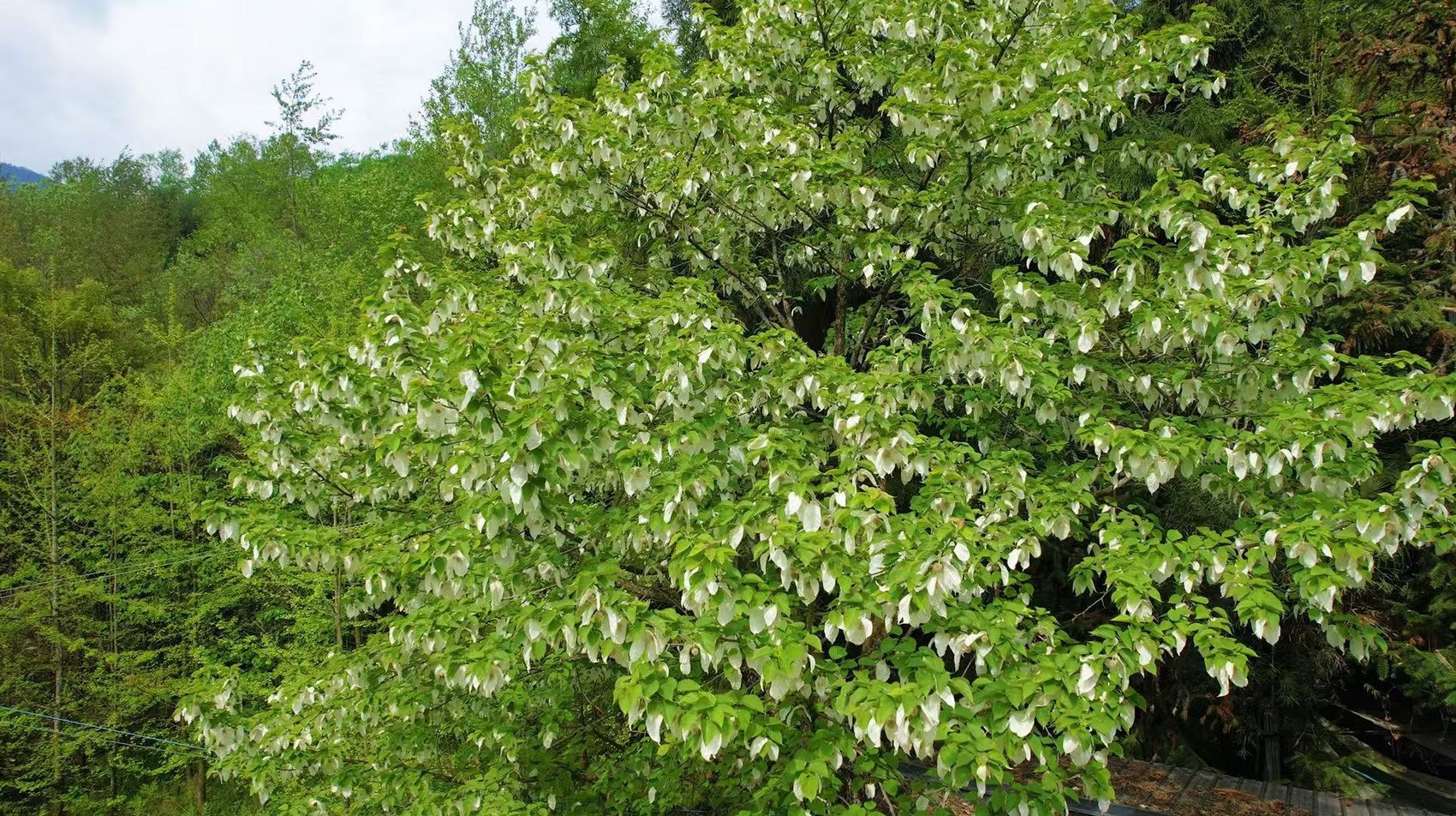 近日,四川绵阳安州区千佛镇海拔1500米以上的山林中,野生珙桐进入盛花期。